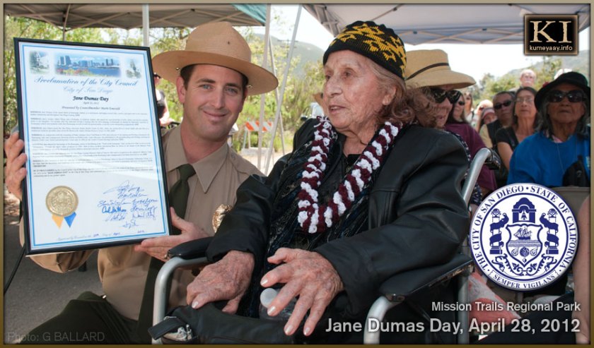 “. . . WHEREAS, Jane Dumas was inducted into the San Diego County Women’s Hall of Fame in 2002 and is recognized as the catalyst for Mission Trails Regional Park acquiring a Kumeyaay-Diegueño Nation flag to fly proudly at the Kumeyaay Lake and Campground in her honor from here on out; AND